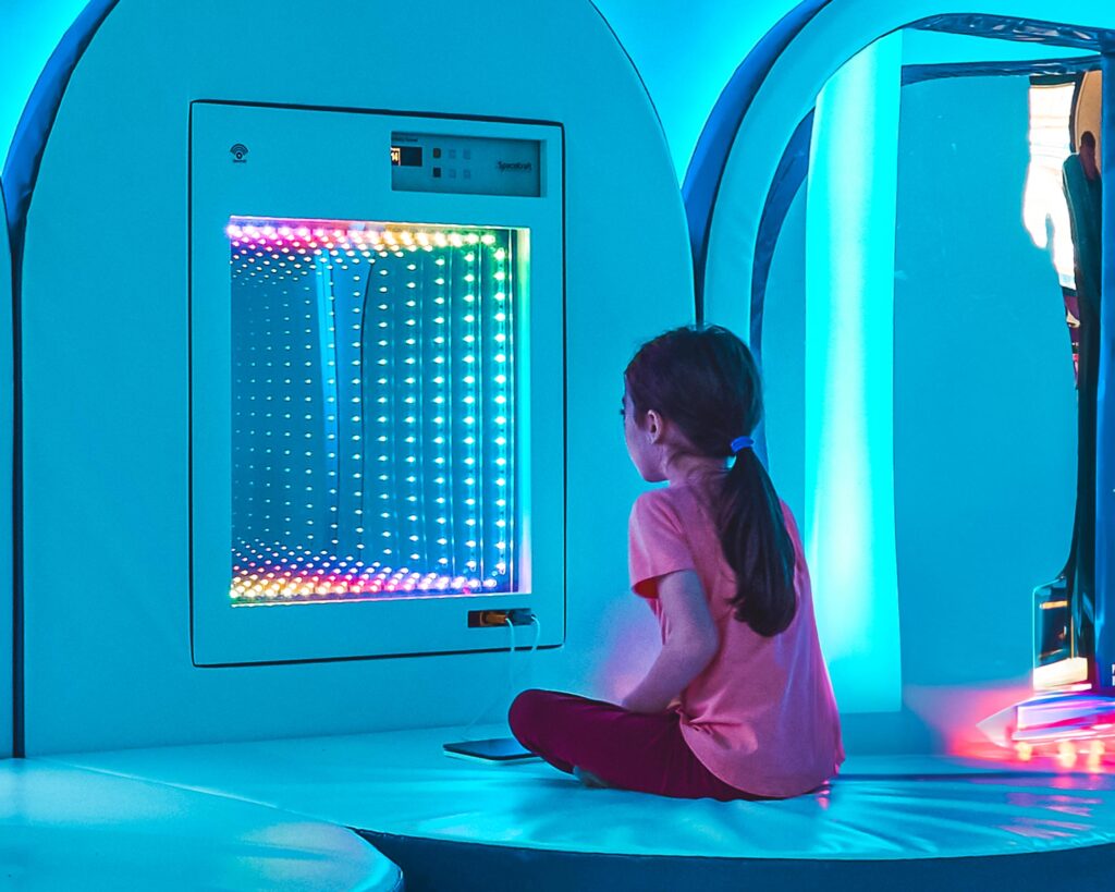 Infinity Wall Panels use mirrors and LEDs to create an illusion of endless space. When children view themselves in the panels, they see an expansive, kaleidoscopic image that captures their imagination. This not only makes them feel larger than life but also helps improve spatial awareness and self-recognition.